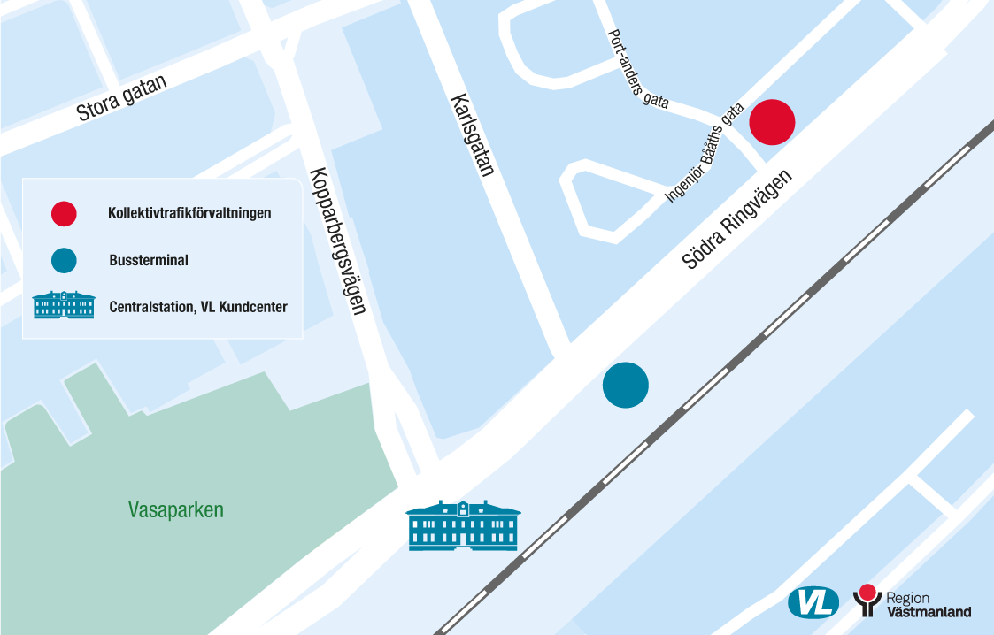 Kartan nedan visar Kollektivtrafikförvaltningens nya besöksadress i förhållande till VL Kundcenter och Västerås centralstation.